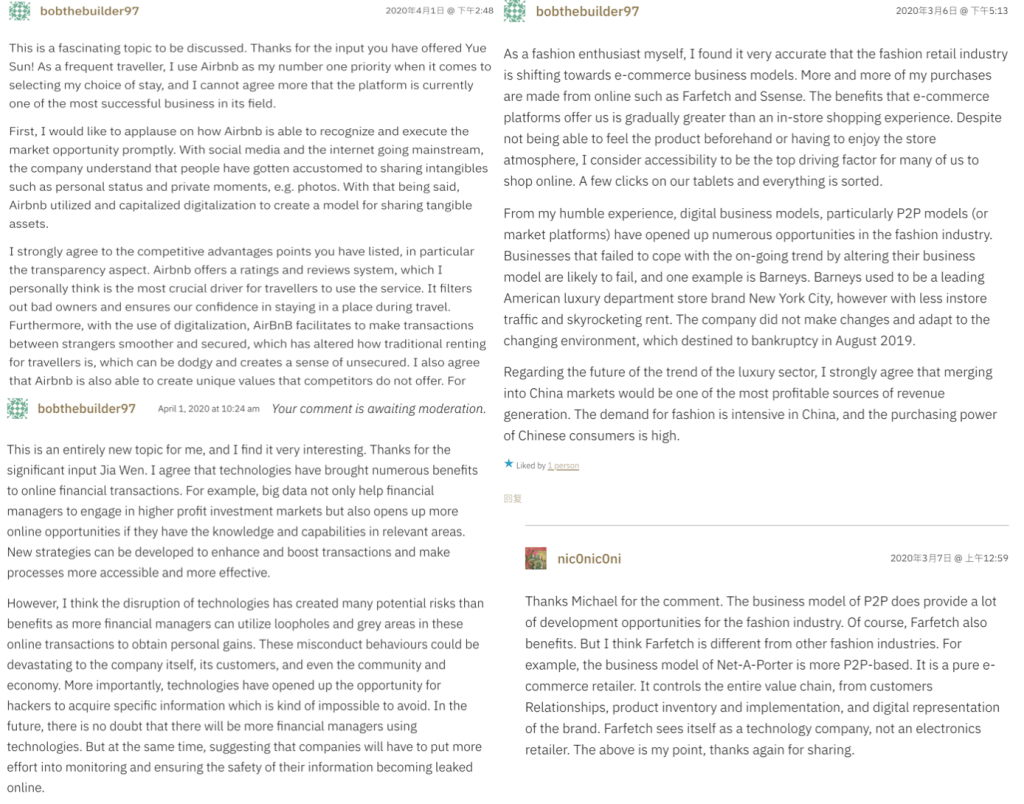 Nico and I had a great conversation over the impact of digitalisation on the fashion industry. We both agreed that the P2P business model provided numerous development opportunities for fashion retailers, such as to attract a significant number of audiences and offer an effective distribution channel. Regarding the post by Sun Yue on Airbnb, her input allowed me to reflect on the importance of sharing economy in the business world. A digital business utilising the share of un-used assets have proven to be significantly crucial in developing long-term success, which is vital to consider for business owners.